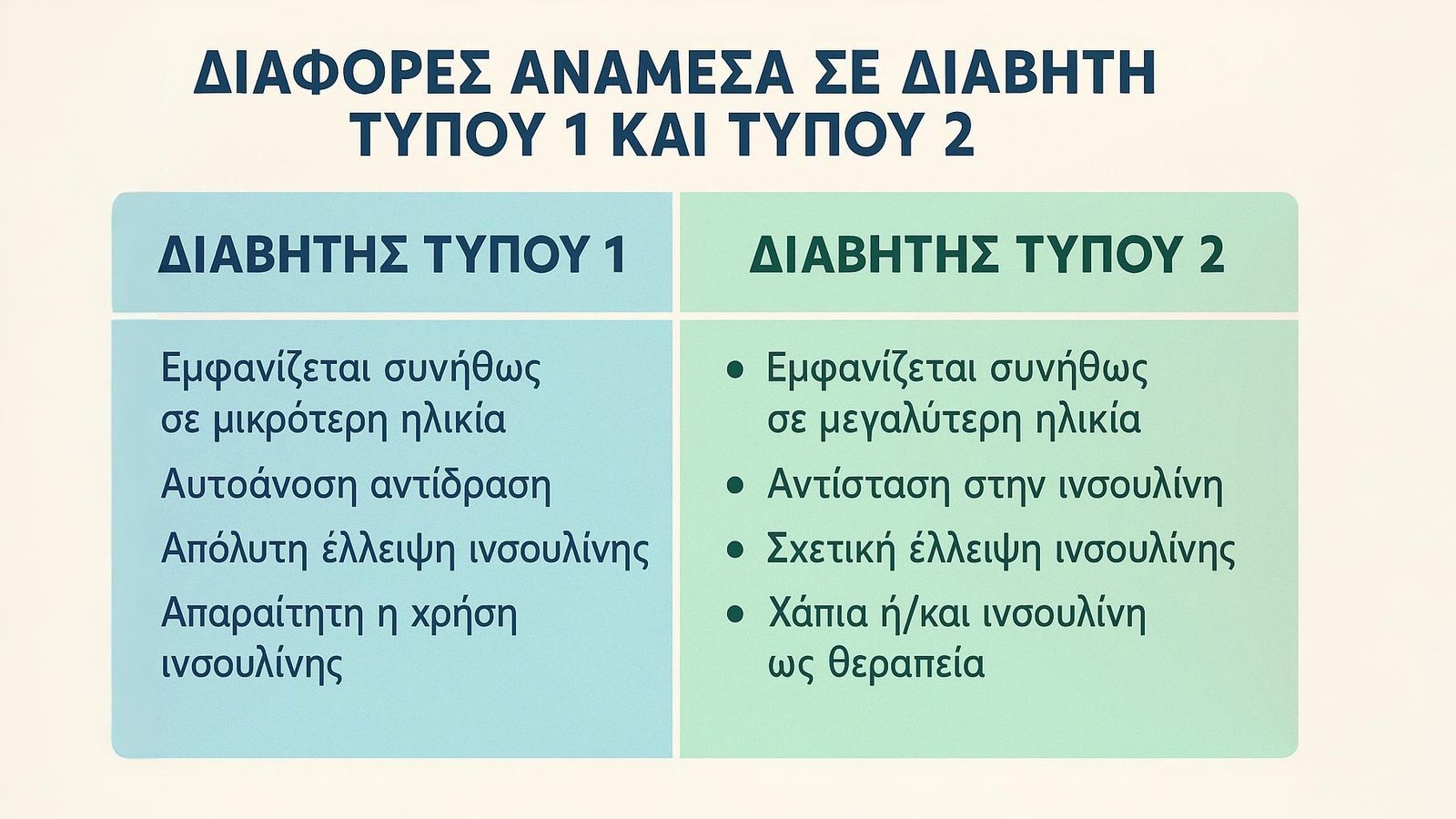 Γνωρίζετε ότι υπάρχουν διαφορετικοί τύποι διαβήτη που επηρεάζουν το σώμα με διαφορετικούς τρόπους; Παρόλο που και οι δύο κύριοι τύποι διαβήτη σχετίζονται με διαταραχές στα επίπεδα σακχάρου, οι διαφορές τους είναι θεμελιώδεις για την κατανόηση, διάγνωση και αντιμετώπισή τους.